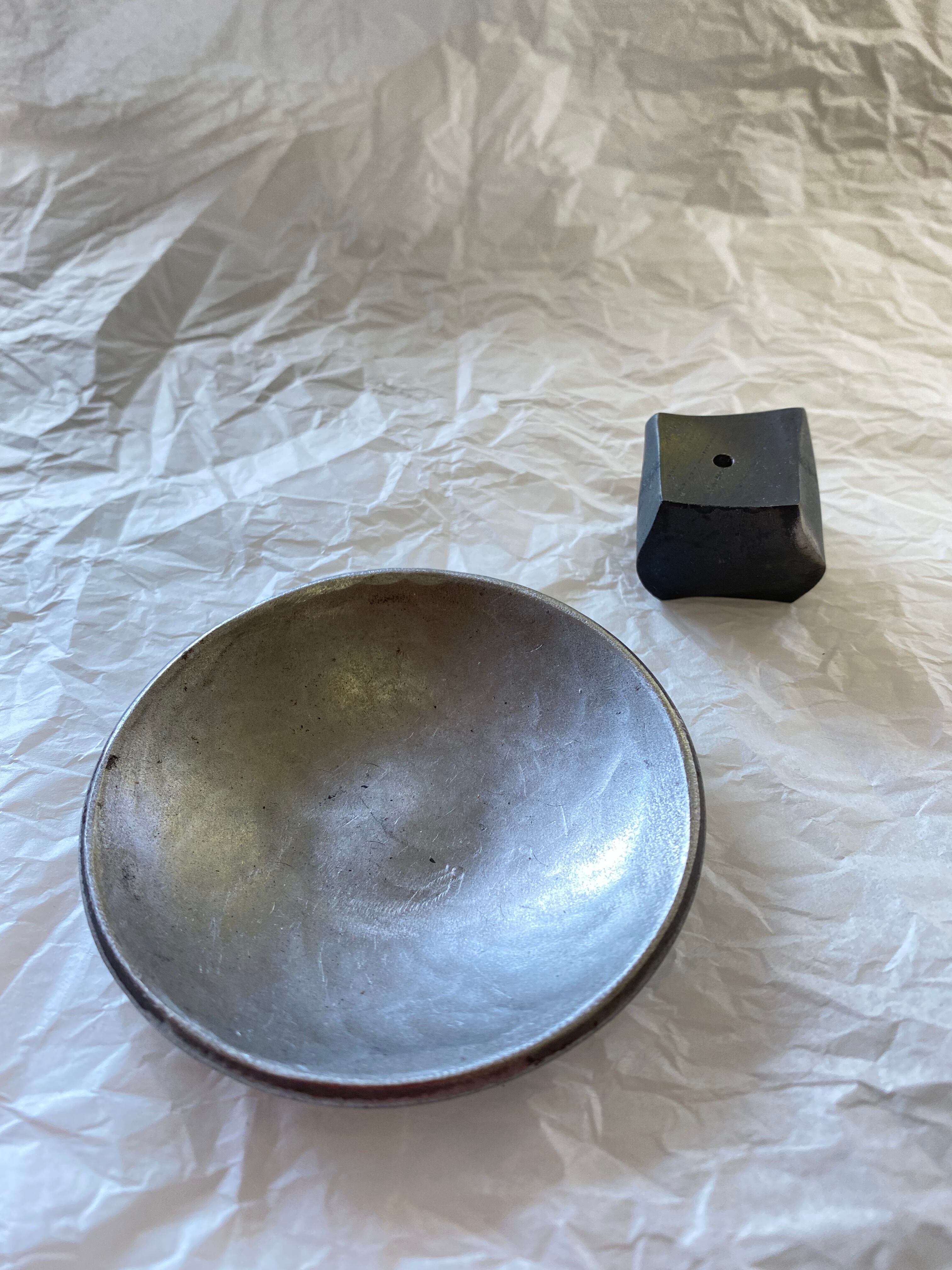 膨らみのある四角のお香立てを丸い皿で受け止める。